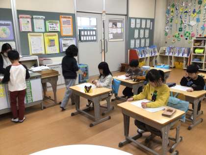 国語科の時間です。つなぎ言葉の学習をしていました。上の文と下の文をつなぐ言葉を選択肢から選ぶ問題でしたが、悩みながら解いていました。