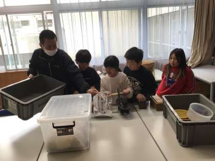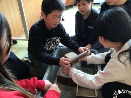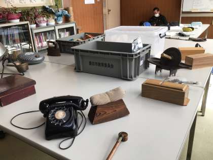社会科の時間です。道具の移り変わりについて学習しています。豊田市博物館からお借りした昔の道具を見たり使ったりしながらどういうものなのかを確かめながら学んでいました。