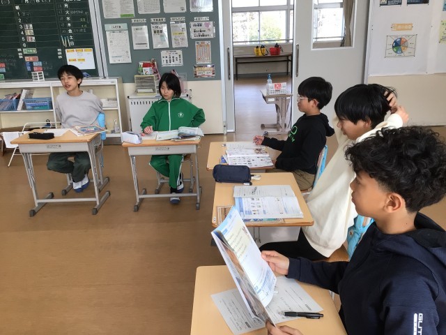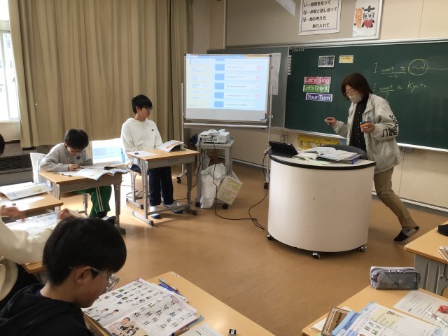 外国語科の時間です。中学校で入りたい部活動や将来の夢を伝え合おうという学習でした。英語の例文の意味をすらすらと答えることができていました。