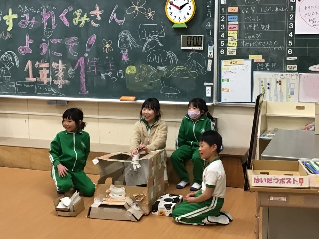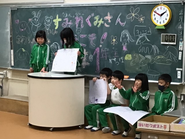 稲武子ども園のすみれぐみさんと交流会を行いました。稲武小学校クイズや手作りおもちゃで、いっしょに楽しみました。