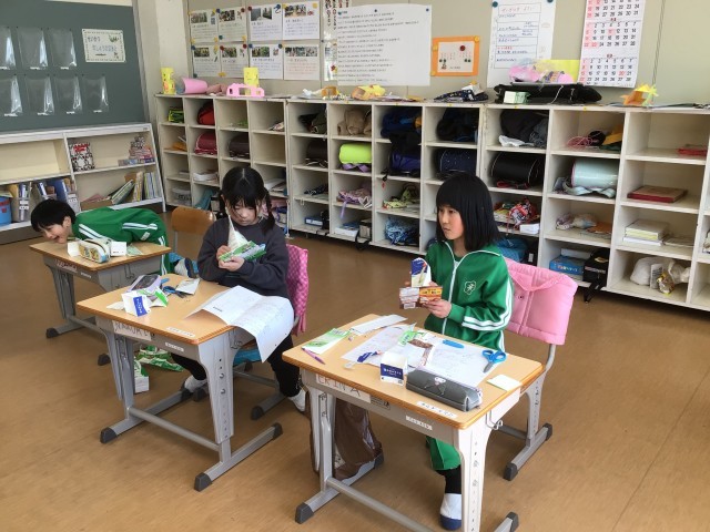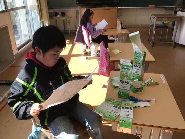 図画工作科の時間です。牛乳パックでボウリングのピンを作っていました。部品としての割りピンを初めて使う子がいたので、使い方を聞いていました。