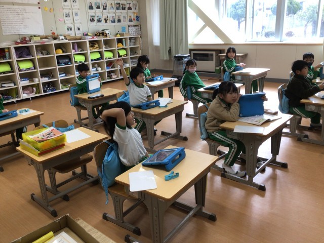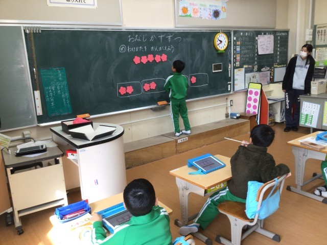 算数科の時間です。同じ数ずつ分けるにはどうしたらよいかを考えています。前へ出て説明したいという子がたくさんいました。