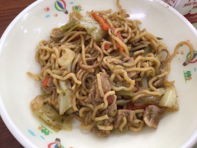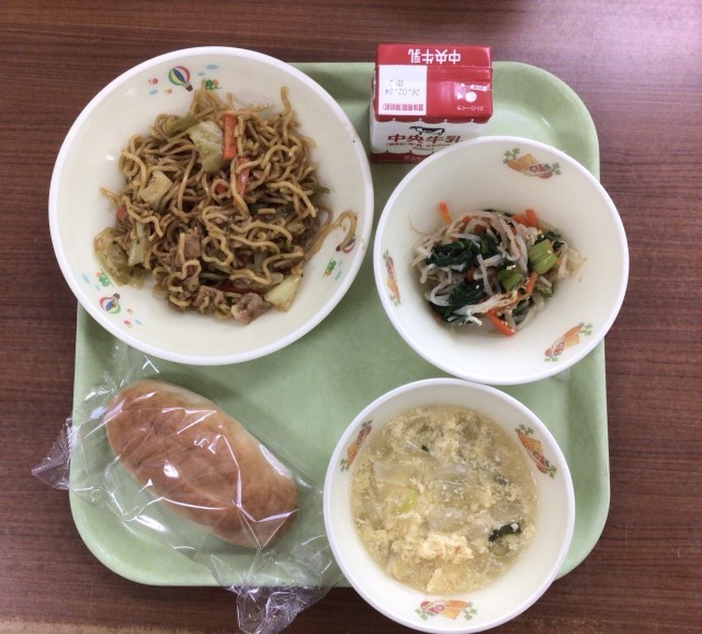 今日の給食は、人気メニューの焼そばです。