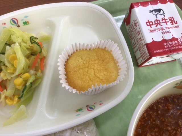 今日の給食のオレンジケーキは、稲武給食センターで手作りしたデザートです。