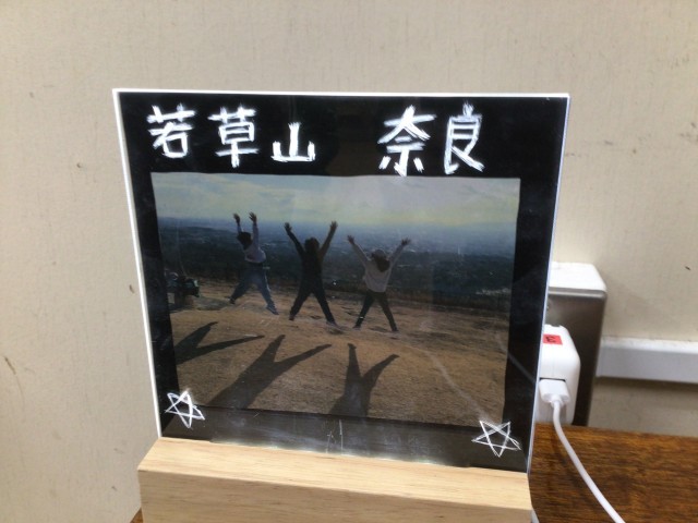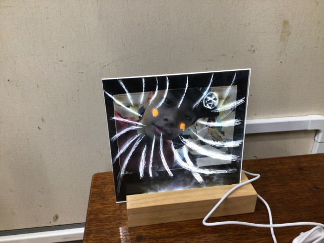 フォトスタンドづくりをしています。表面に彫刻刀で傷をつけるようにすることで模様が描けます。ライトをつけるとそこが光るというものです。傷に蛍光ペンを使えば、色もつけられるようです。