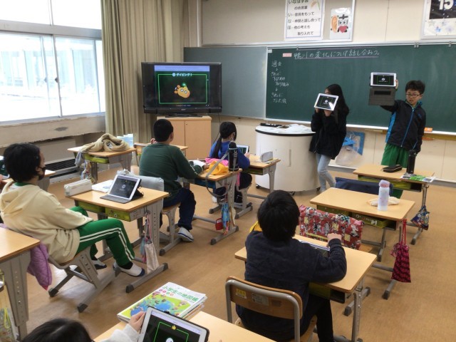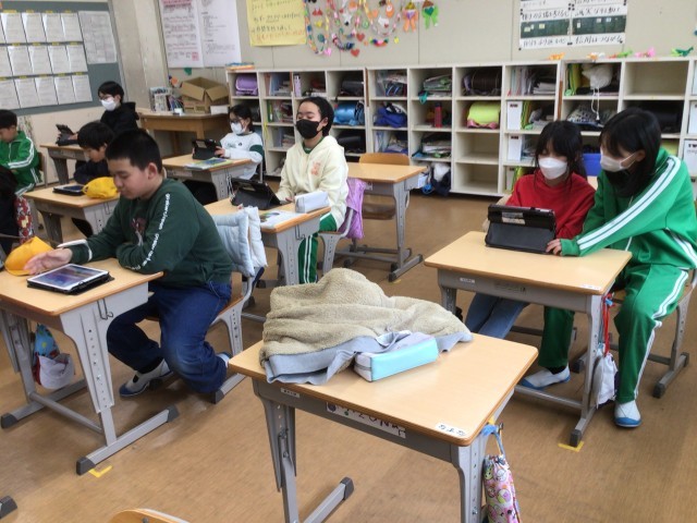 社会科の時間です。学習用タブレットのアプリを使って復習をしていました。ゲーム形式で、さらにみんなで助け合って進めていくものだそうです。いつも以上に集中していました。