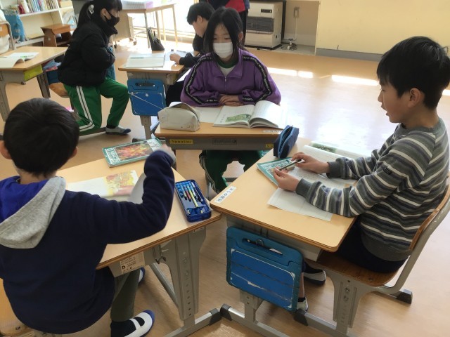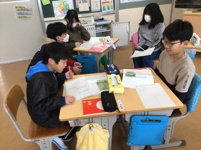 国語科の時間です。物語文「世界一美しいぼくの村」についての学習でした。各自で登場人物の思いを考えた後、ペア学習で友だちの意見を聞き合っていました。