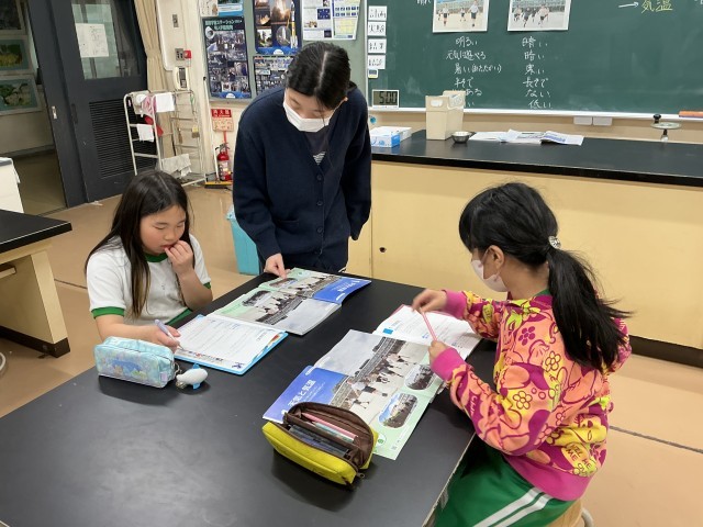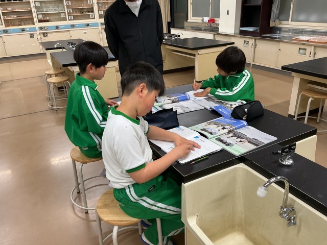 理科の時間です。天気による気温の違いについて、その原因となる要素をそれぞれで考えていました。