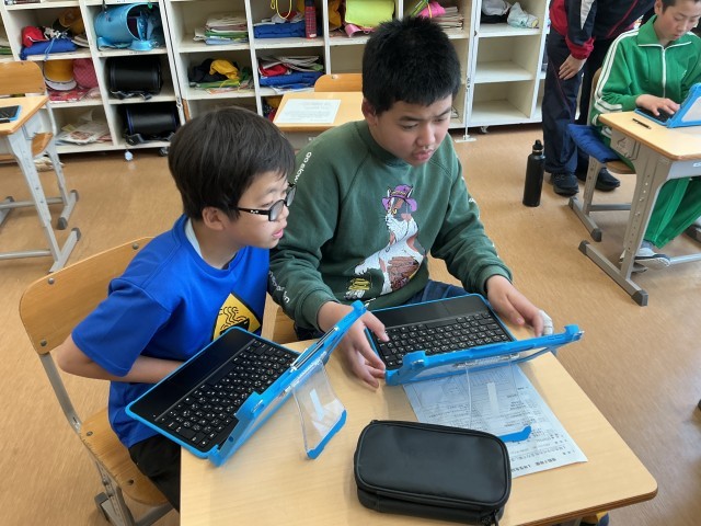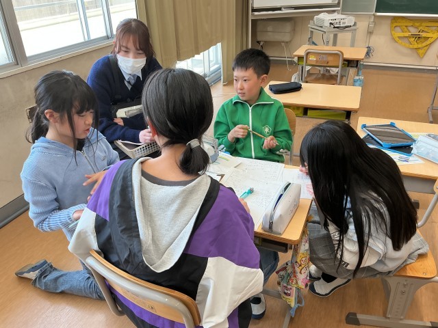 学活の時間です。1年生を迎える会の準備中でした。会の中で行うゲームの説明の仕方を1年生がわかるようなものにしようと考えていました。