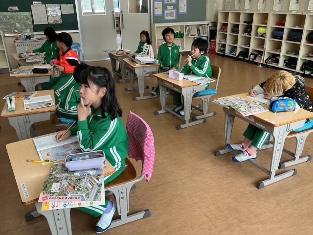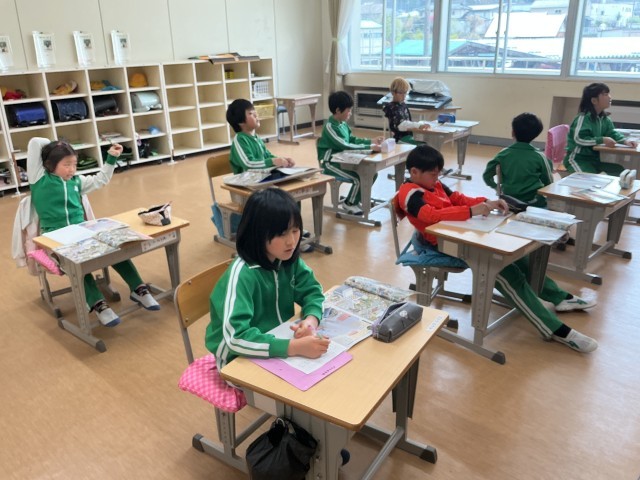 社会科の時間です。「わたしたちのまち」の単元の学習でした。稲武にはどんな場所があるのかについて知っていることを出し合っていました。