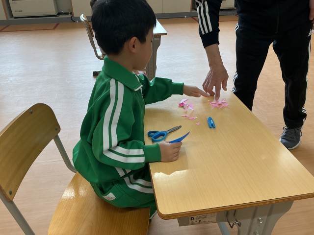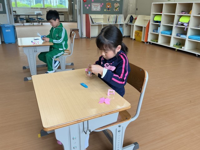 生活科の時間です。先週、学校案内をしてくれた2年生へのお礼にとプレゼントづくりをしていました。折り紙でお花を作っています。喜んでもらえるといいですね。