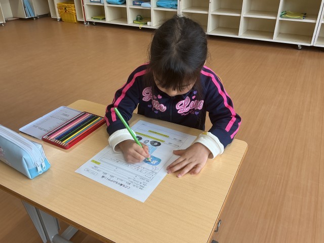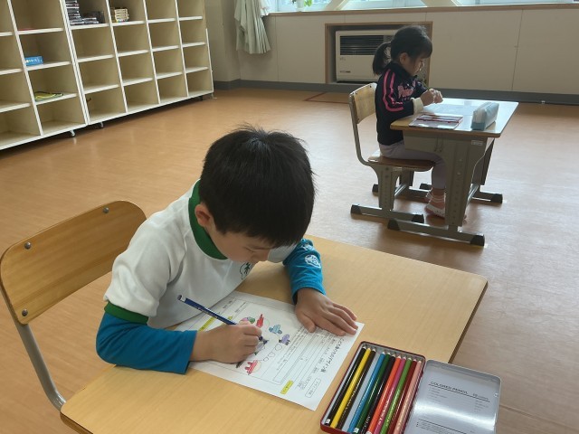 図画工作科の時間です。「あったらいいな こんなのりもの」のテーマでオリジナルの車を描いていました。たくさんの色を使って塗っていました。
