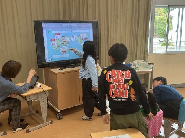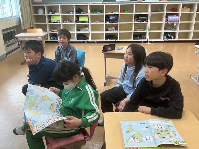 外国語活動の時間です。世界のいろいろな国のあいさつについて学んでいました。「こんにちは」だけでもさまざまですね。
