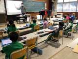 3年生が中心となって、6年生に関するクイズをだしました。問題を出題する子どもた...