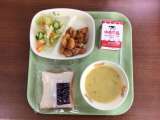 【今日の献立】 スライスパン とり肉のケチャップがけ 豆乳コーンスープ サワーキ...