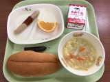 【今日の献立】 サンドイッチロールパン カレーブルスト 野菜とたまごのスープ い...