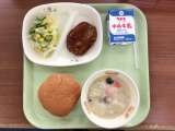 【今日の献立】 サンドイッチバンズ ハンバーグ フレンチサラダ 白菜のクリーム...