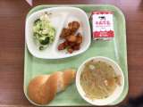 【今日の献立】 ツイストパン とり肉のケチャップがけ 花野菜のサラダ オニオン...