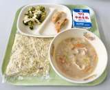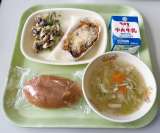 11月18日(木)の給食は、 【中華麺、とんこつラーメンの具、牛乳、揚げぎょうざ...