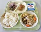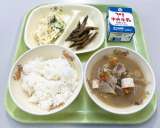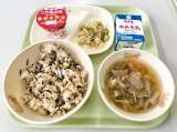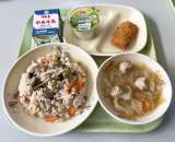 11月19日(金)の給食は、 【ひじきごはん、牛乳、ポリポリサラダ、牛ごぼう汁、...