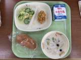 【今日の献立】 米粉パン コーンフレークチキン コールスローサラダ クリームス...