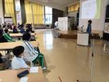 3年生が中心となって、6年生に関するクイズをだしました。問題を出題する子どもた...