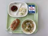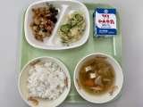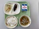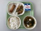今日の献立 ごはん 豆乳入りみそ汁 鶏肉のから揚げ のり酢あえ 給食によく登場...