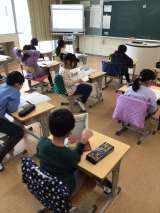 1年生は学習用タブレットの使い方について学んでいます。自分のパスワードを紙を見...