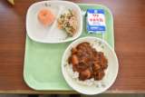 【今日の献立】 ハヤシライス ツナとアスパラのサラダ 冷凍みかん 給食では...