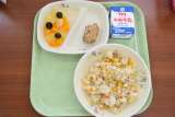 【今日の献立】 コーンピラフ とり肉のハーブ焼き フルーツミックス 今日は...
