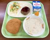 9月22日(水)の給食は、 【ツイストパン、牛乳、ささみ大葉梅肉フライ、おさつサ...