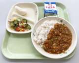 9月28日(火)の給食は、 【トマトと大豆のキーマカレー、牛乳、パプリカサラダ、...