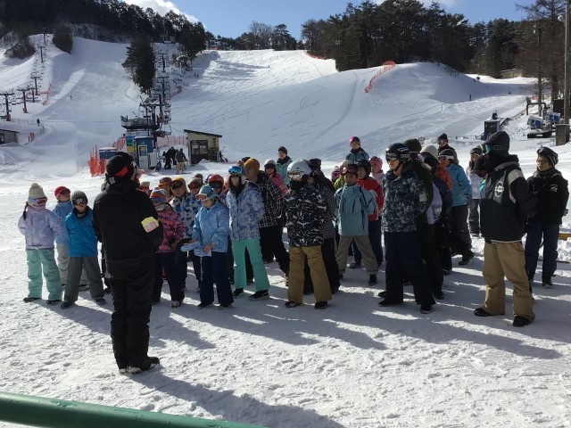平谷高原スキー場に着いて開会式をしました。このあと班ごとに分かれて滑り始めます。