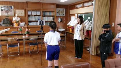 4月24日(月)朝8時40分ごろ、校長室でオンライン朝礼を行いました。企画・福祉・放送・環境・生活・運動・図書・保健・給食の9人の委員長が、活動の計画や委員長としての抱負を話してくれました。どの委員長もあらかじめ言葉を考え、大きな声で堂々と発表することができました。