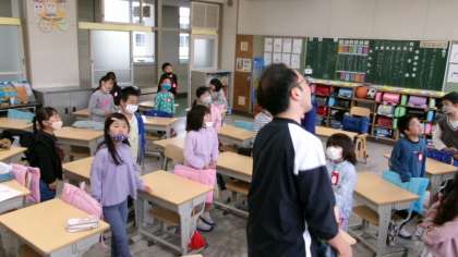 毎朝8時半過ぎに、2年生の教室から明るい歌声が聞こえてきます。教室の壁に歌詞が貼ってあり、どの子も大きな声で元気よく校歌を歌っています。