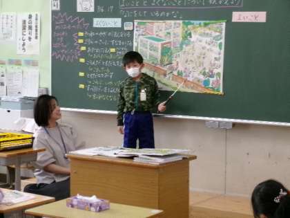 本日5月23日(火)第2・3校時は、第1回授業参観1日目(1〜3年・789組)でした。1枚目の写真は、1年生の道徳「よいこと わるいこと」です。学校でたくさんの動物たちがいろいろなことをしている絵の中から、よいことをしている動物を見つけて発表するなどしました。