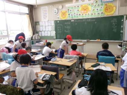 本日5月24日(水)第2・3校時は、昨日に引き続き第1回授業参観日2日目(4〜6年)でした。1枚目の写真は、4年生算数「わり算の筆算」の授業の様子です。「立てて、かけて、ひいて、おろして」と、一つ一つ丁寧に手順を確認しながら学びました。あるクラスでは児童が赤い帽子をかぶってミニティーチャーとなり、席を回って友達に教えていました。