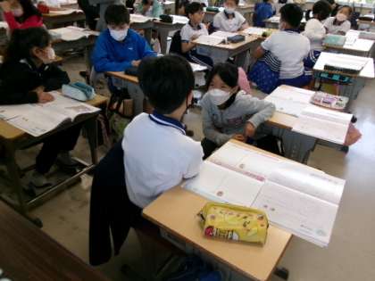 2枚目は、5年生の道徳「父の仕事」の授業中の様子です。隣同士でペアになり、主人公の気持ちについて自分の考えを発表しました。ペアの子の考えをしっかり聞こうという気持ちが、乗り出すような姿勢に表れているように感じました。
