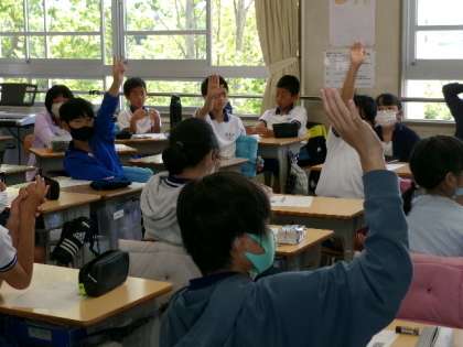 3枚目は、6年生のデジタル・シチズンシップ(情報モラル)教育「SNSについて考えよう」です。比較的身近な話題のためか、ざっくばらんに発表し合い、活発な意見交換がなされていました。中には、自分と友達の意見を比較しながら聞き、ハンドサインで立場を示し、つなげる発言ができていた児童もいました。さすが最高学年だなと感心させられました。