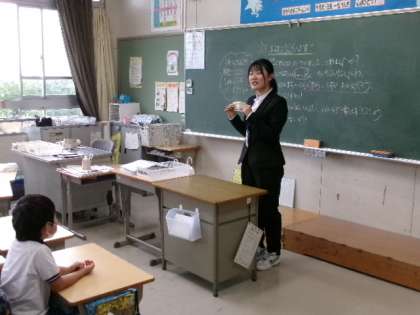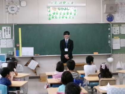上の写真は、実習生が朝の会で自己紹介をしているところです。2人の実習生は、自分の趣味を紹介したり、簡単な手品を披露したりしてくれました。