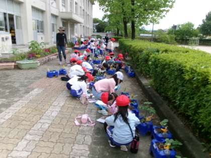 井上小学校では、5月上旬から多くの児童が植物を育てています。毎朝登校後は、自分の鉢の様子を欠かさず観察し、野菜や花への水やりを続けています。