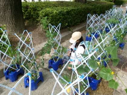 写真1枚目は5月13日、2枚目は5月25日、3枚目は6月5日の2年生の水やりの様子です。小さかった苗が50センチ以上に成長していますね。