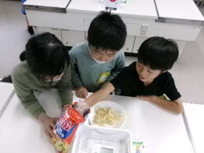まず、1日のおやつの目安量は、1日に必要なカロリーの10分の1で、約200キロカロリーだということを学びました。次に、ポテトチップスではどれくらいの量になるのかを各班ごとに予想し、実物を紙皿に盛り付けました。20〜30グラムと予想する班が多かったですが、実際は35グラムが正解でした。続いて、食事の2時間前までに食べることや、パッケージの裏面の表示を見るとよいことも教えていただきました。