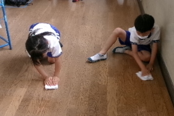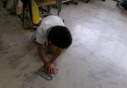 1・2枚目は3年生の教室、3枚目は1年生廊下の清掃の様子です。下ぶき雑巾の分担の児童が、雑巾を2つに折って両手で押し付けながら汚れを取り、膝をついてバックで進んでいます。きれいにしようという心を込めた雑巾がけです。井上っ子の鑑ですね。