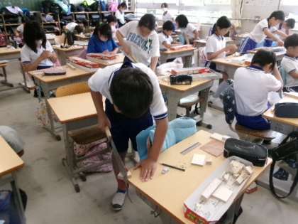 2枚目は、全校縦割り活動「ゆりのき遊び」運営の練習です。〇×クイズをやるのでしょうか。とても真剣に取り組んでいました。3枚目は、図工「ギコギコトントンクリエーター」です。のこぎりで木材を切り、紙やすりで削ってすべすべにしています。どんな作品ができるのか、とても楽しみですね。