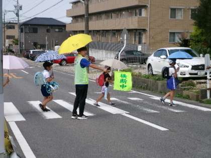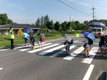 昨日7月11日(火)から、夏の交通安全市民運動が始まりました。写真は。本日12日(水)朝8時ごろの、御船方面通学団の登校の様子です。地域の方と本校の教員が、黄色い旗を持って、横断歩道で立哨指導をしています。厳しい暑さの中での傘さし登校のため、車がよく見えるように、横断歩道は傘を高く上げて左右確認するように声をかけています。