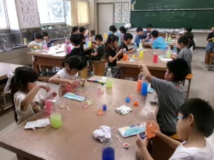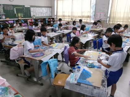 9月6日(水)第2校時の授業の様子です。1枚目は1年生の図工の様子です。カラフルな色水がとてもきれいでした。2枚目は2年生の図工です。どろどろ絵の具を使って段ボールに絵を描いていました。3枚目は3年生の算数です。タブレットで迷路を作っていました。