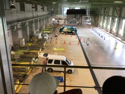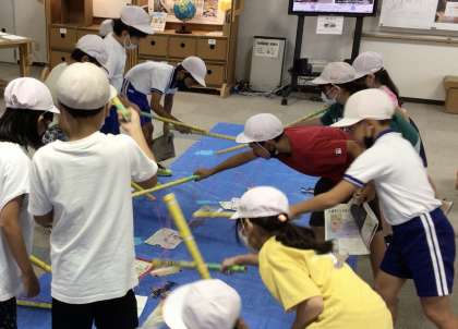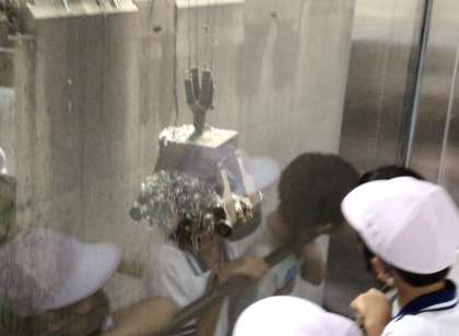 エコットでは、ごみ釣りゲームなどで正しいごみの分別の仕方を学習し、その後、渡刈クリーンセンターの見学コースを回りました。各家庭から集められたごみがピットに入れられる様子や、巨大なごみクレーンの動く様子を上から眺めました。大迫力のクレーンの動きに、児童たちの目は釘付けになっていました。