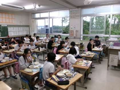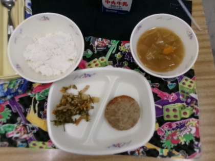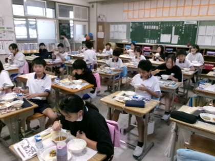 9月11日(月)の6年生の給食の様子です。今日の献立は、「糸切昆布の炒め煮・さんが焼き・玄米だんご汁・ごはん・牛乳」でした。さすが6年生です。おいしく、ほとんど残さずに、いただいていました。