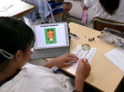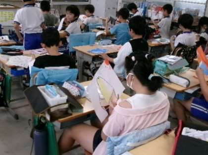 第1校時の授業の様子その2です。4年生の1クラスは、絵手紙を作っていました。水彩絵の具で絵を描いた後、構図を考えながら切り取る作業をしている子もいました。5年生の1クラスは、国語「問題を解決するために話し合おう」でグループ活動をしていました。タブレットも使いながら、しっかりとした意見の交流がなされていました。6年生の1クラスは、修学旅行のしおりの表紙づくりをしていました。タブレットを使ってご当地キャラクターを調べ、表紙のイラストに加えている児童もいました。